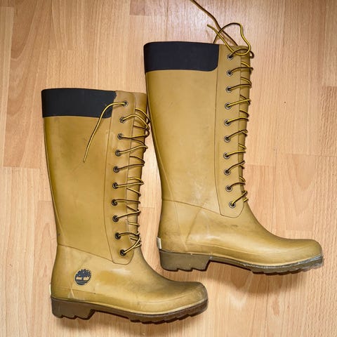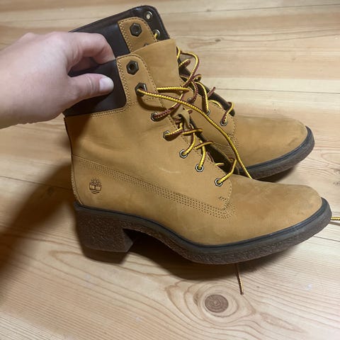 Timberland støvler i størrelse 36. Støvlene har en lys rosa farge og er laget i et slitesterkt materiale. Egnet for bruk i ulike utendørsaktiviteter. Har noen bruksmerker fremme på skoen