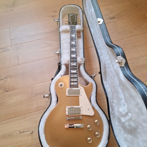 Gibson Les Paul elektrisk gitar i sunburst-farge. Modellen har to humbucker-pickuper, hvit pickguard, og klassisk Les Paul-design. Gitaren er produsert i USA. Et par bruksmerker, men ingenting av betydning for lyd eller spillbarhet.