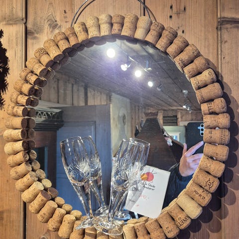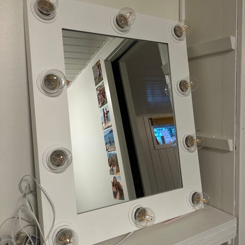 A veggspeil med integrert lysestake. Speilet har en svart ramme og en metallholder for lysestake i front. Passer til dekorasjon og belysning i hjemmet.