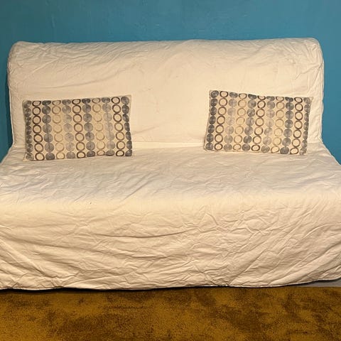 Praktisk og svært anvendelig sofa som kan slås opp til behagelig soveplass for 2 personer. God plass til sengetøy under den ene soveplassen. Svært enkel å slå opp, og enkel demontering hvis man må flytte på den, bare 4 unbraco skruer. Vi hadde aldri solgt den, hadde det ikke vært for at vi har flyttet. Det følger med 3 puter.