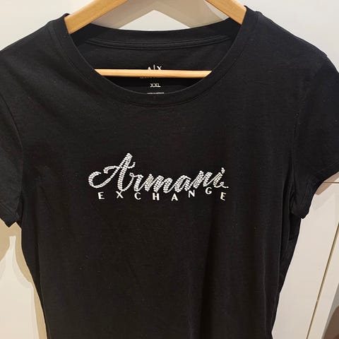 Armani Jeans topp med kjempefint trykk i paljetter foran. Knapt brukt. IT42 tilsvarer M/38. Kjøpt på Zalando.