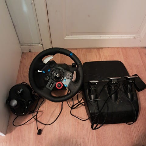 Logitech G29 Racing Wheel med pedaler, inkludert ratt og tre pedaler (gass, brems, clutch). Produktet er designet for bruk med racingspill og simuleringsspill, og gir realistisk kjøreopplevelse. Pedalene har metalloverflater, og rattet har integrerte knapper og rattstripe for presisjonskontroll.