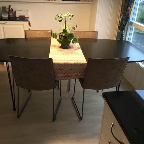 Spisegruppe fra Jysk selges grunnet flytting. Medfølger 6 stoler (ikke bare 4 som på bildet). Det er plass til 3 stoler på hver langside av bordet.