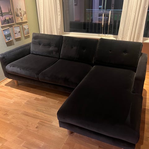 Selger denne sofaen grunnet flytting. Den er mørk grå farge i velourstoff. Fint brukt!
