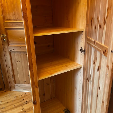 Skap i lys ask, finer. 1 stort skap med 2 speildører i midten, 2 enkle skap på hver side med 4 skuffer nederst. Skapet er demontert og kan hentes i Haugesund.
