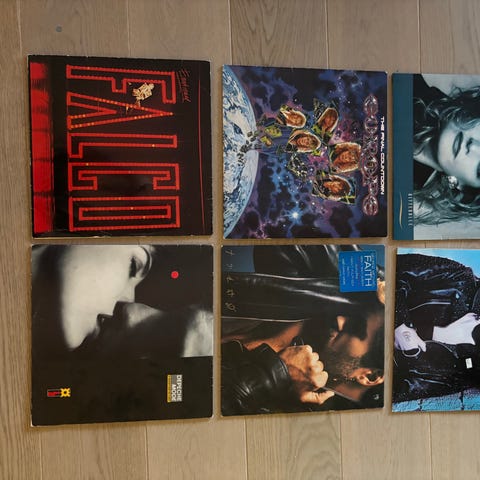Samling av vinylplater med forskjellige album og coverdesign. Passer for samlere eller musikkinteresserte.
