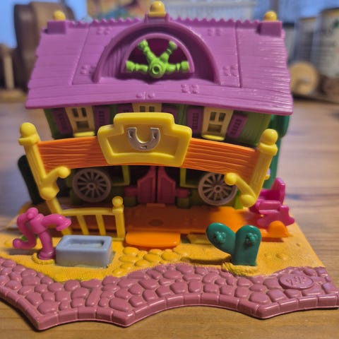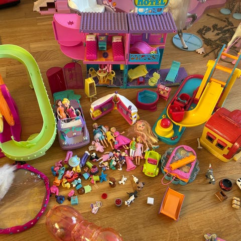 Polly Pocket ski hotell med sklie og 3 små figurer. Settet består av en lilla og blå plaststruktur med flere lekeområder,en sklie og skøyte bane og Bade basseng.
