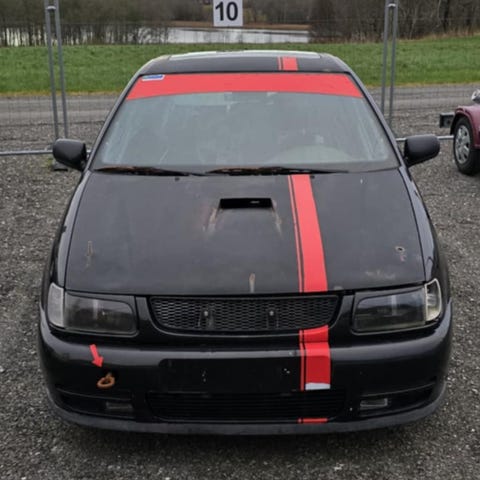 Bilsete med blått og svart trekk. Setet viser tegn på slitasje og har rifter i materialet.