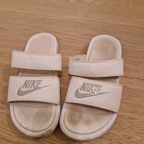 Paris slippers i størrelse 39. Slippersene har en svart såle og en bred stropp med teksten 'PARIS' i beige og svart. Knapt brukt.
