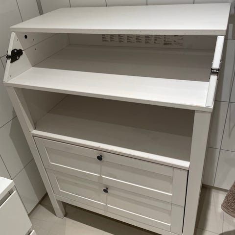 Kan åpne/lukke plata på toppen, som gir den fleire bruks området. Stor og god hylle over skuffene.