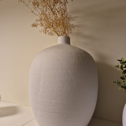 Stilren og dekorativ vase med et moderne, luftig mønster. Vasen er produsert i plast og passer perfekt til for eksempel tørkede strå, pampasgress eller som et rent dekorobjekt. Den kompakte størrelsen gjør den enkel å plassere på bord eller hylle.