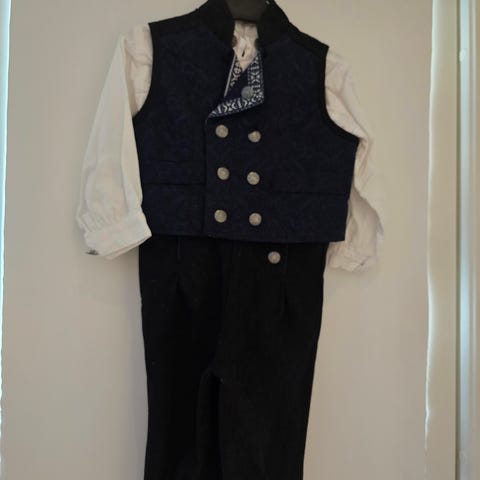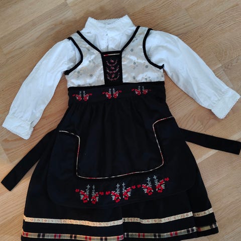 Pent brukt festdrakt fra småtroll i størrelse 2-3 år. Det medfølger skjorte og forkle.
