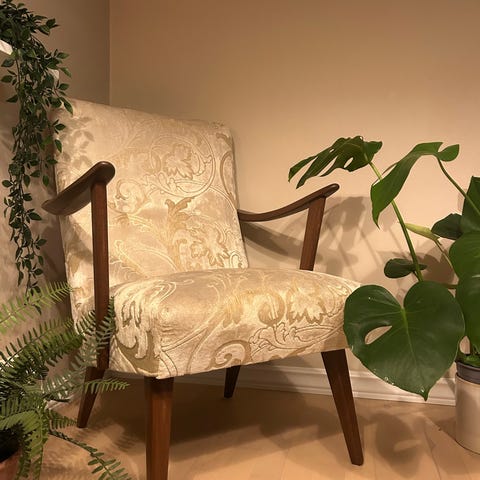 Flott retro lenestol i teak. Den har nydelig design og veldig god å sitte i. Originalt trekk i god stand.