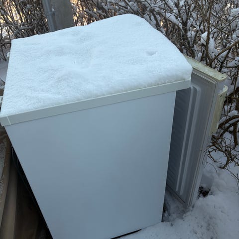 Gammelt og godt brukt Gram fryseskap med flere hyller for oppbevaring. Egnet for lagring av frosne varer. Testet og fungerer. Må hentes