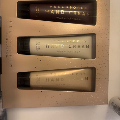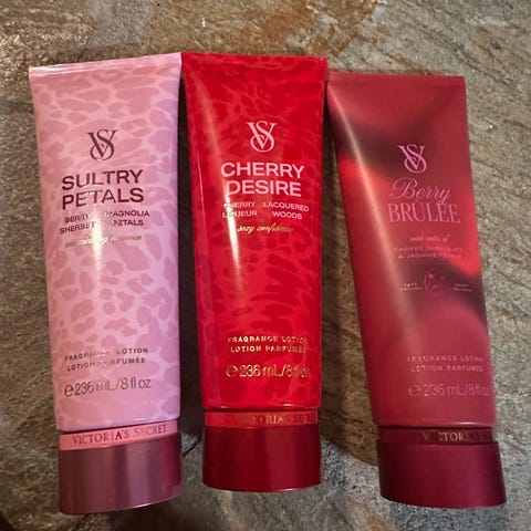 Fruit Works parfyme kroppsspray i rosa flaske, samt en gyllen øyemaske for kald behandling. Inkluderer også en liten beholder med krem eller gelé. Produktene er egnet for personlig pleie og velværfe.