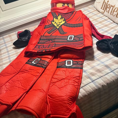 LEGO Ninjago Kai kostyme for barn i størrelse Medium, passer for alderen 7-8 år. Kostymet er unisex og har rød farge, designet for å ligne karakteren Kai fra Ninjago-serien. Ubrukt da vi fikk to like til jul.