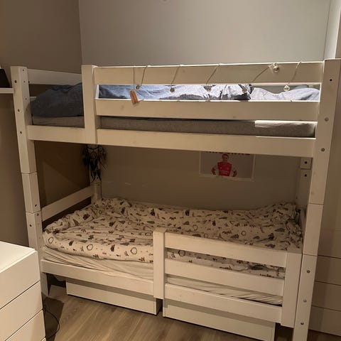 Sengen er i god stand. Den er skrudd fra hverandre og madrass følger ikke med. Noen klistremerker på den hvite langsiden, men denne kan vendes inn når man monterer så de ikke sees