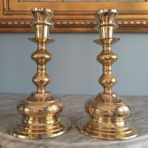 Et par store, håndlagede messinglysestaker, produsert i Norge og stemplet