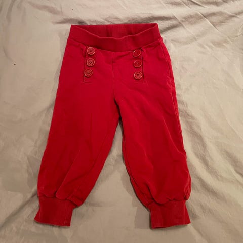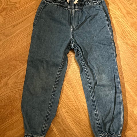 Olabukse fra Lindex str 104. Lommer bak. Glitrende sommerfugler på knærne. Glitrende strikk i livet, kan strammes med knapper.