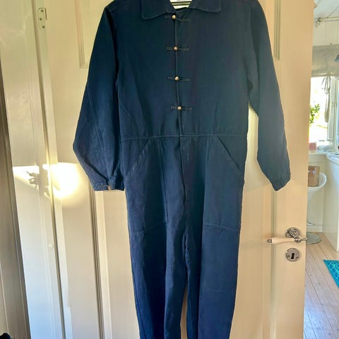 Indiska jumpsuit i blå farge, størrelse L for kvinner. Laget av viskose og elastan materiale. Plagget har kort erme og belte i livet, vide bein.