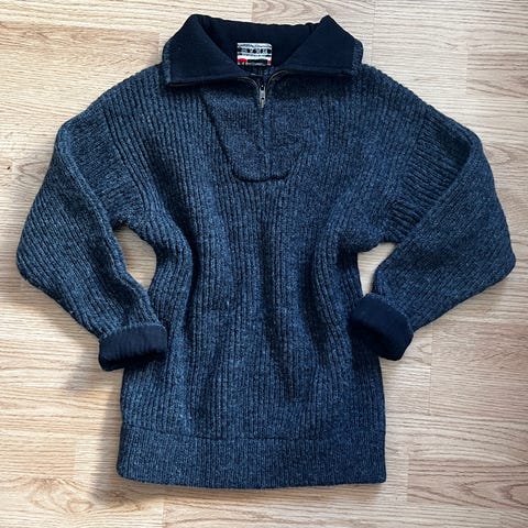 Klassisk og varm ullgenser fra Bekken & Strøm i 100% Shetland-ull. Genseren har høy hals med glidelås og ribbestrikket struktur. Perfekt til tur og fritid i kaldt vær. Farge: mørk grå med sort fleecefôr i halsen og nede ved ermene. Passer gutt / jente som bruker 152 i klær, i tillegg til dame XS (jeg er dame på 153 cm og denne passer veldig fint). Dyre- og røykfritt hjem.
