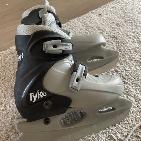 Tyke ishockeyskøyter for barn i størrelse 28. Skøytene har svart og grå farge med justerbar stropp for god passform. Egnet for ishockeybruk.