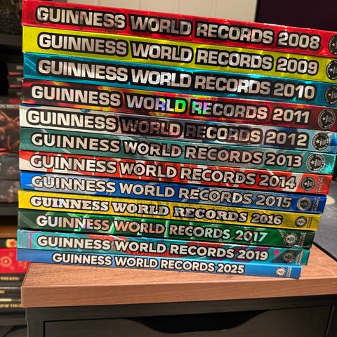 Guinnes world records bøker selges billig, årstall fra 2005-2015 med unntak av 2014.