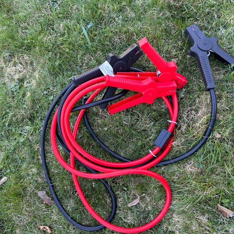 Jump Leads startkabler med lengde på 2,4 meter. Kabler med røde og svarte klemmer, pakket i en gjennomsiktig oppbevaringspose. Egnet for å starte bilbatterier ved hjelp av en annen bil.