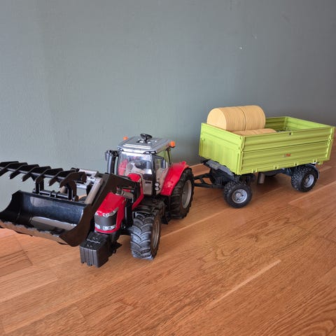Utrolig fin leketraktor med henger! Denne er pent lekt med, så her er det ingen mangler jeg kan finne. Hengeren kan åpne bakluken, men forøvrig er det lås på, slik at den ikke skal åpne seg i tide og utide. Skuffa på traktoren kan heves og senkes manuelt.