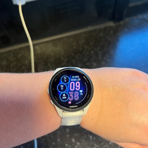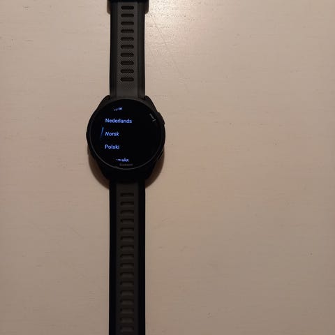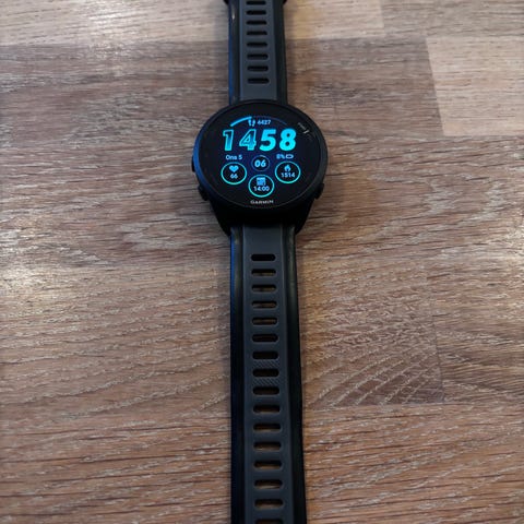 Garmin Forerunner 165 med svart reim selges overgang til ny klokke. Klokken har en rund skjerm og tilbyr funksjoner for helseovervåking og aktivitetssporing.