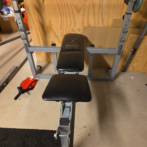Praktisk treningsbenk til styrketrening. Benken kan stilles i forskjellige vinkler, og høyden kan justeres etter behov. Det følger med 45 kg vektsett (5 kg x 2, 7,5 kg x 2 og 10 kg x 2), 138 cm lang stang og benkpresstativ.