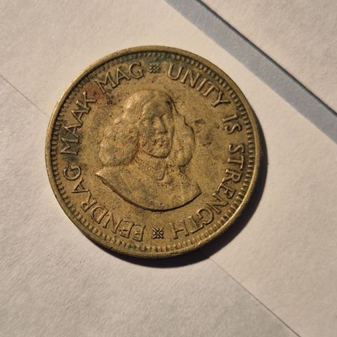 2 stk Sørafrikansk 1 cent-mynt fra 1961. Mynten viser et bilde av en oksekjerre, som er et viktig symbol i sørafrikansk historie, og et portrett av Jan van Riebeeck, en nederlandsk koloniadministrator som grunnla Cape Town. 100 kr stk