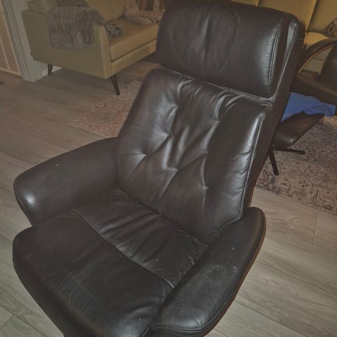 Selger våre to grønnlige skinn stoler av merket Himmola med metall såle og integrert fotskammel. Meget pent og lite brukt. Ønsker å selge de samlet 8000 pr stol, 16000 for begge.
