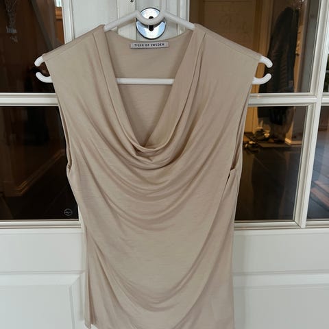 Stilren og klassisk sort topp fra Tiger of Sweden selges. Elegant modell med høy hals og kort erm, som gir et moderne og tidløst uttrykk. Myk og behagelig i stoffet – passer like godt til hverdags som til jobb eller pent bruk.
