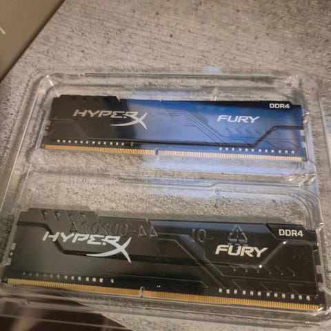 HyperX Fury DDR4 RAM med totalt 16GB (2x8GB) 2666MHz. Har vært lagret i uoriginal emballasje siden de ble byttet ut.