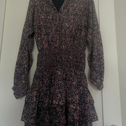 Neo Noir Hverdagskjole i størrelse S, fargen hvit og blå. Kjolen har et mønster i blått og hvitt, med lange ermer og V-utringning. Egnet for hverdagsbruk.