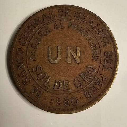 1/2 Sol de Oro fra Peru, utgitt i 1960/1962. Mynten er laget av messing, har en vekt på omtrent 7,3 gram og en diameter på 27,1 mm. 2 stk. Selges samlet for 200 kr