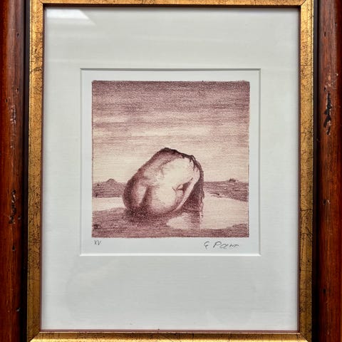 Eldar Parr litografi kunstverk nummerert 221 av 300. Verket er innrammet med sort ramme og viser en scene med flere menneskelignende figurer i et landskap. Signert av kunstneren