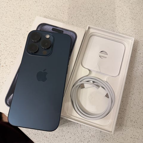 Jeg selger en meget pent brukt iPhone 15 Pro 128 GB i fargen Black Titanium for 7490 kr. Telefonen har 88% batterikapasitet, og leveres med ubrukt original ladekabel og kvittering.