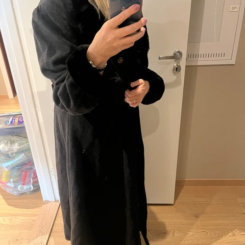 En klassisk kåpe i nydelig materiale; 70% wool, 15% angora, 15% kaschmir. Den holder deg god og varm. Stilfull kåpe med lengde til midt på leggen. Fargen er lysebrun/muldvarp. Belte og stikklommer i sidene.