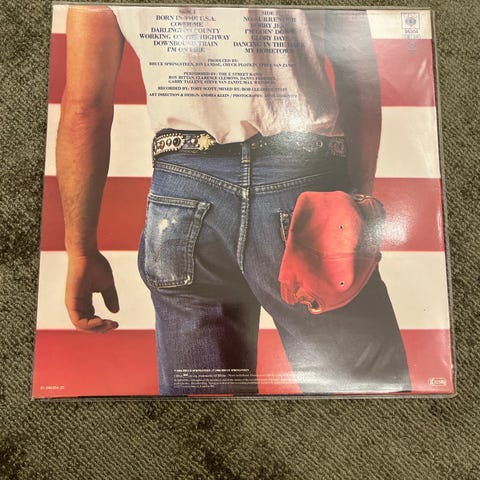 Bruce Springsteen Born in the U.S.A. vinylplate med CBS etikett. Albumet inneholder flere kjente låter og har original cover med bilde av en mann i jeans og hvit t-skjorte med en rød caps i baklommen.