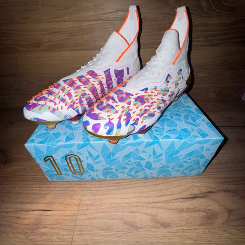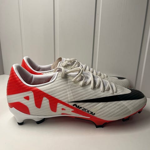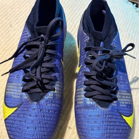 Nike Mercurial fotballsko i størrelse 41. Fargen er gul med svarte og oransje detaljer. Designet for fotball med knotter for godt grep på banen.