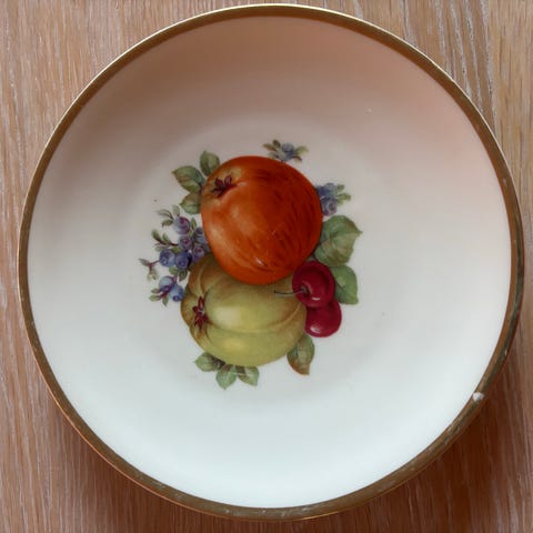 Dekorativ vintage asjett frai bavarisk porselen fra Schumann Arzber . Gjennombrutt kant med gullkant og klassisk motiv av rips (Ribes rubrum). Har synlige bruksspor og alderspreg, men er hel og pen.