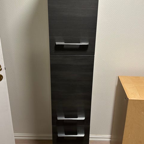 IKEA Lillangen servantskap i hvit farge. Skapet har to dører og en utskjæring på toppen for å tilpasses servant. Inne i skapet er det en hylle for oppbevaring. Laget i slitesterkt materiale, egnet for baderom.