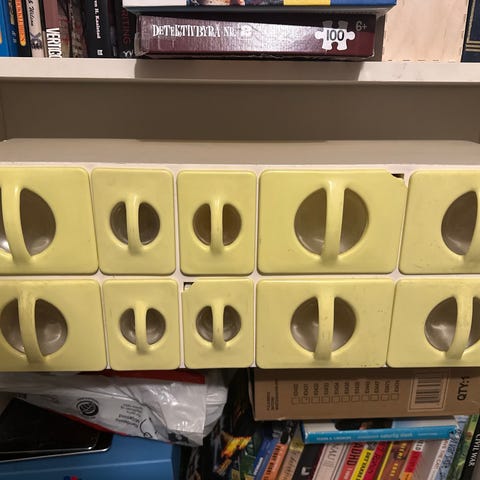 Sett med to originale Panco søppelbøtter i gul plast. Én stor og én liten. Klassisk kjøkkenmodell. Originale braketter til veggoppheng følger med.