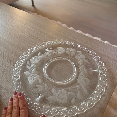 Selger et stort og dekorativt fat (31 cm i diameter) i klart pressglass med vakkert blad-/fjærmønster. Klassisk retrodesign, trolig fra 1970–80-tallet.