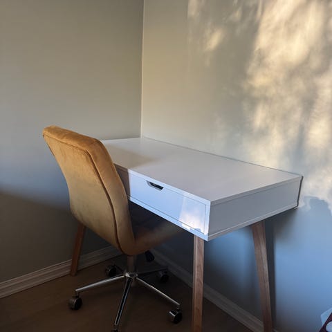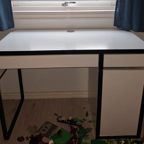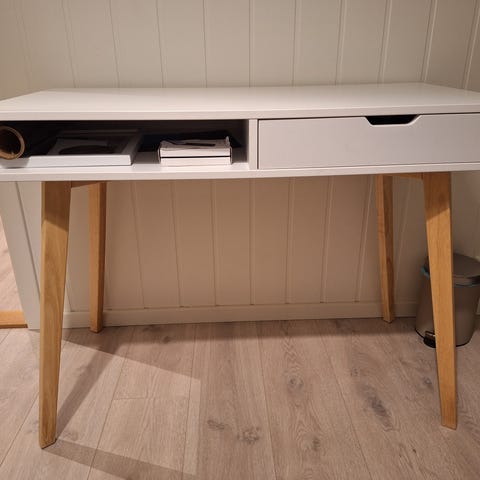 Svært lite brukt skrivebord fra Jysk som heter Tamholt. I fargen hvit/natur. Nypris er 1399kr.