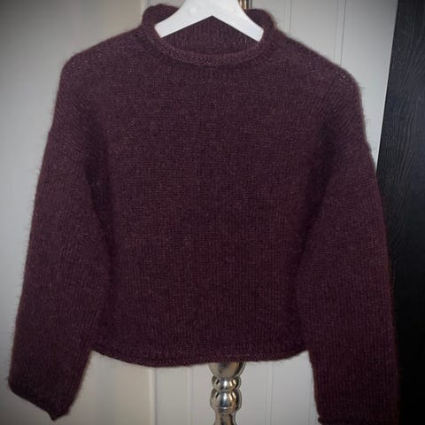 Hjemmestrikket i ulike ullgarn. Strikket som en str M No limits sweater, men istedenfor “pæreform” er bolen helt rett fra under ermene.