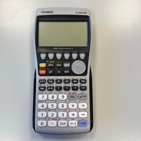 Casio fx-9860GII Kalkulator med multifunksjonelle beregningsmuligheter. Enheten har en digital skjerm og et tastatur med ulike matematiske funksjoner inkludert trigonometriske, statistiske og eksponentielle beregninger. Designet for generell bruk i skole og arbeid.