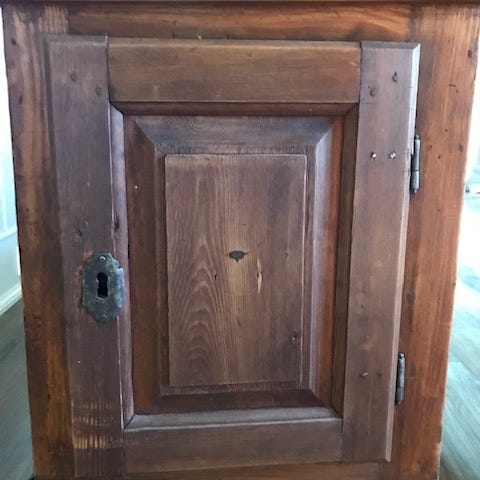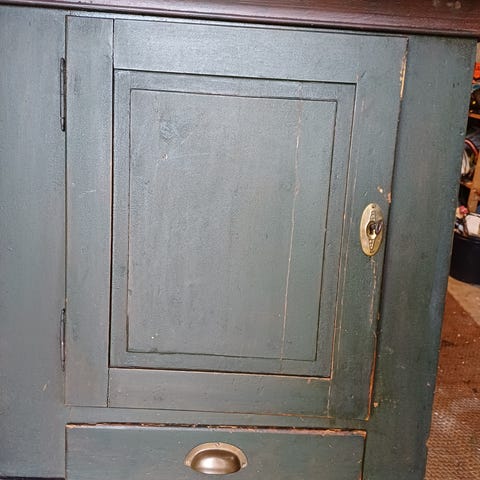 Innredet med hylle. Dørknott med låsefunksjon. Dør hengslet med skinn. Primitivt lite skap med mye sjel. Pakker og sender hvis ønskelig. Høyde 35 cm. Bredde 27 cm. Dybde 17 cm